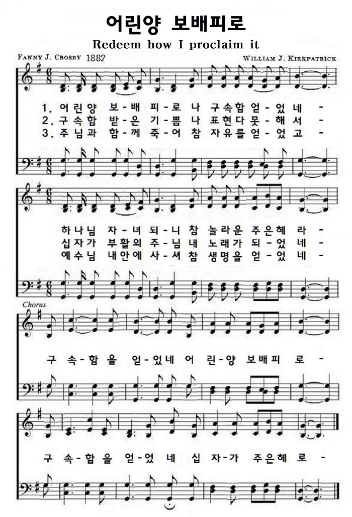 "Redeemed How I love to proclaim it" 는 화니 제인 크로스비가 1882년에 지은 곡입니다. 구속(救贖)함을 받은(Redeemed) 기쁨을 찬양합니다. 구속(救贖)은 값을 지불하고 다시 사오다 즉, 값을 지불하고 구원해낸다는 의미 입니다. 구속은 속량과 거의 같은 의미로 쓰이는데 속량은 값을 지불하고 노예를 양민으로 해방시켜준다는 의미지요