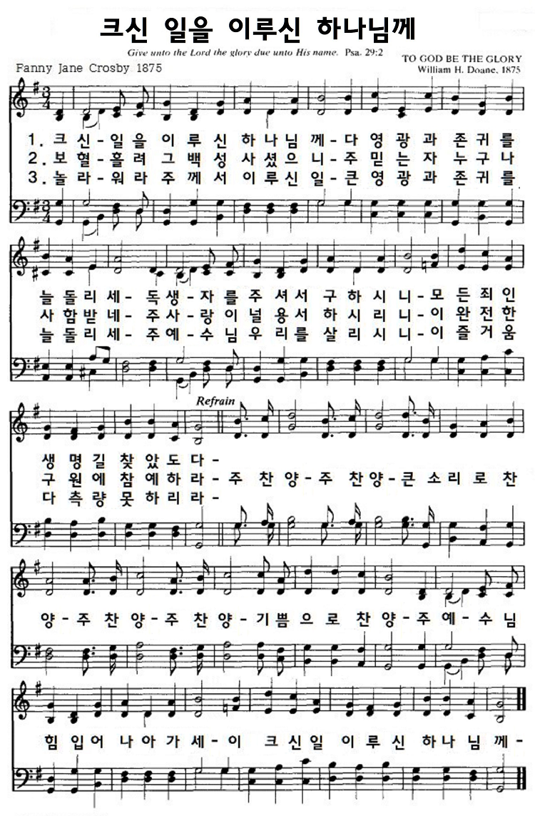 "크신 일을 이루신 하나님께"(To God be the glory)는 하나님께서 행하신 큰 일(행2:11) 곧 그리스도 구속 사역을 찬양하고 있습니다.